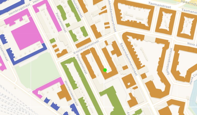 De Key (bruine kleur) was  heel goed vertegenwoordigd in de Spaarndammerbuurt. Van het U-vormige blok waren per 1-1- 2012 70 van de 71 woningen corpo-bezit, per 1-1-2024 54. Een afname van 17 in 12 jaar.