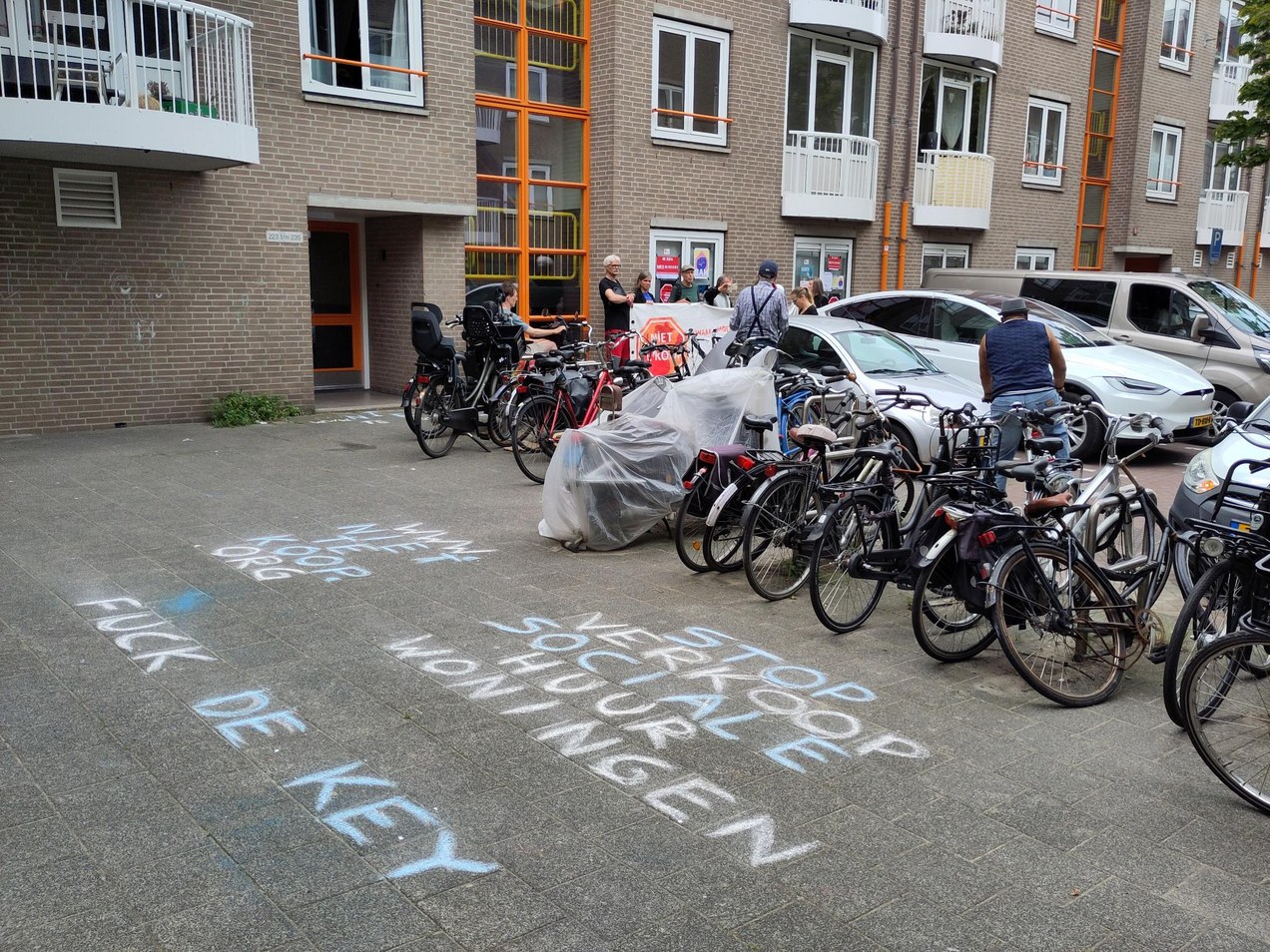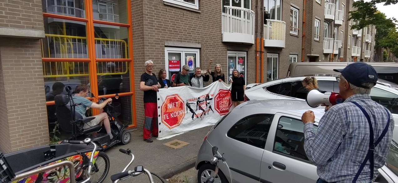 ![]() Affiche Janboel Weer neemt actiegroep Niet Te Koop vastgoedbedrijf De Key op de korrel. Met haar 220ste flitsactie. Immers, zij verkoopt niet alleen benedenwoningen en grote gezinswoningen, zij bijt ook in haar eigen staart: zij verkoopt ook starterswoningen, de verhuur waarvan als kerntaak wordt gezien. De voormalige HAT-woning Swammerdamstraat 229-H staat nu te koop voor €275.000. Een éénkamerwoning van 27 m², betekent dat de m²-prijs hoger is dan €10.000! Dat hebben we nog niet eerder gezien bij een corporatie. HAT: Huisvesting voor Alleenstaanden en Tweepersoonshuishoudens We weten allemaal dat de missie van woonstichting Lieven de Key is het realiseren van tijdelijke en betaalbare ‘woonconcepten’ in Amsterdam. Overal in de stad verrijzen kazernes met studio’s voor ‘woonstarters’. Het volkshuisvestelijke doel van de corporatie is het ‘zetten van de eerste stappen op de woningmarkt’ van jongeren tot 28. Als je binnen 5 jaar geen carrière opbouwt, ben je uitgewoond en kan je terug naar Hotel Mamma, of je wordt dakloos. Bevolkingspolitiek De corporatie doet aan bevolkingspolitiek. Over Stepstone, de kazerne met flexhokken aan de Zuidas, zegt de corporatie: ‘De woonstarters zorgen voor meer levendigheid in de buurt en maken ook gebruik van de voorzieningen buiten de kantooruren’. Is Lieven de Key de weg kwijt? En over Swammerdamstraat 29: in 1983 werd het blok met 14 HAT-eenheden opgeleverd voor woningbouwvereniging Onze Woning. HAT staat voor Huisvesting voor Alleenstaanden en Tweepersoonshuishoudens. De huurcontracten voor deze eenheden waren niet tijdelijk maar permanent. De bewoners waren in de gelegenheid om op vrijwillige basis eigen keuzes te maken. Corporatie Lieven de Key is de bedoeling van volkshuisvesting volledig kwijt. De woning Swammerdamstraat 29-H zou toch volledig moeten passen in de strategie van ‘woonconcepten voor woonstarters? Pied-à-terre…. Maar wat zegt de corporatie in de makelaarstekst? ‘Of je nu een starter bent op zoek naar je eerste eigen plek, een student die dicht bij de universiteit wil wonen, of op zoek bent naar een fijne pied-à-terre in Amsterdam, deze studio is de ideale keuze.’ Pardon?! Het leveren van een pied-à-terre hoort géén volkshuisvestelijk doel te zijn van een corporatie! ![]() Het pand met de 14 HAT-eenheden, Swammerdamstraat 29. Nummer 29-H is eenhoog rechts, met de slordig dichtgetrokken gordijnen. De woning telt slechts één kamer en kent alleen een voor, geen achter. De woningen staan ruggelings tegen elkaar. Doorluchten is er niet bij. ![]() ![]() De Key (bruine kleur) is in dit gebied de enige aanwezige corporatie. Van de 14 HAT-eenheden blijken er volgens de corporatiekaart van 1-1-2024 al 8 te zijn verkocht. Blijkbaar vindt de corporatie het lastig om te moeten dealen met een VVE en wil ze er gewoon van af, ondanks dat het bieden van een woning aan starters uitstekend past in een van haar kerntaken. Zaterdag flitsactie 220 Niet Te Koop gaat door met haar flitsacties. We hebben het nodige bereikt. Met name dat de doorgaande verkoop van sociale huurwoningen door woningcorporaties voortdurend onder de aandacht wordt gebracht van publieke opinie, politiek en pers. Ook al wordt de indruk gewekt dat die verkoop aan banden is gelegd: dat is maar in zeer beperkte mate het geval. Niet Te Koop eist een totale stop. Weer zien we nu een woning, geknipt voor een starter in de volkshuisvesting, prijs gegeven worden aan de kapitaalmarkt. Er wordt zelfs geopperd om het te kopen als pièd-a-terre: een tweede woonhuis, meestal in een andere stad gelegen en doorgaans kleiner dan de primaire verblijfplaats in de gemeente waar men ingeschreven is. Een schande! Deze nieuwsbrief met opnamen van de vorige actie wordt verstuurd naar politiek, pers, woningcorporaties en huurdersorganisaties. Onze acties houden het vuurtje brandend. Plaats van de flitsactie 220: Swammerdamstraat 29-H, tussen de Amstel en het Oosterpark in Oost. Zaterdag 5 juli, 15.00. De flitsactie zal ongeveer een half uur duren en bestaan uit 1. beflyeren van de buurt en voorbijgangers ; 2. het beplakken van de gevel en 3. het maken van opnames voor de publiciteit. Actiegroep Niet Te Koop zorgt voor spandoeken, affiches, stoepkrijt en wat niet meer. Maar u mag zelf natuurlijk ook materiaal meenemen. ![]() Opnamen van flitsactie 219 Naast een noodhuisvester voor jongeren is Lieven de Key een makelaar die de allermooiste sociale woningen verkoopt en de minste en slechtste woningen bij hoge uitzondering verhuurd. In het jaarverslag heeft de copywriter het slechts over ‘de eerste stappen op de woningmarkt’ voor ‘woonstarters’. Er wordt nog slechts gedacht aan ‘vernieuwende woonconcepten’. Voor de corporatie is het: huurder dood = woning te koop. Zoals de benedenwoning Houtrijkstraat 229 waar de huurder is overleden. Die gaat De Key niet verhuren bijvoorbeeld via de gemeentelijke regeling Van Hoog Naar Laag, nee, die gaat De Key verkopen! Vraagprijs liefst €600.000, leve de gentrificatie! En na verkoop komt de woning nooit meer terug: niet betaalbaar, niet sociaal. Afgelopen zaterdag 28 juni voerde actiegroep Niet Te Koop hiertegen haar 219de flitsactie. Een journalist van het Engelse dagblad The Guardian was er voor interviews! ![]() ![]() ![]() |