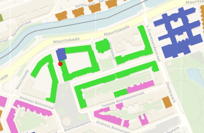 In lichtgroen Stadgenoot-complexen ten noordwestwn van het Oosterpark bij de Mauritskade. Inmiddels is de helft verkocht en wat wordt verkocht komt nooit meer terug. Muntendam 3 behoort tot een VVE met 77 wooneenheden waar nu nog 33, minder dan de helft, in corporatiebezit.